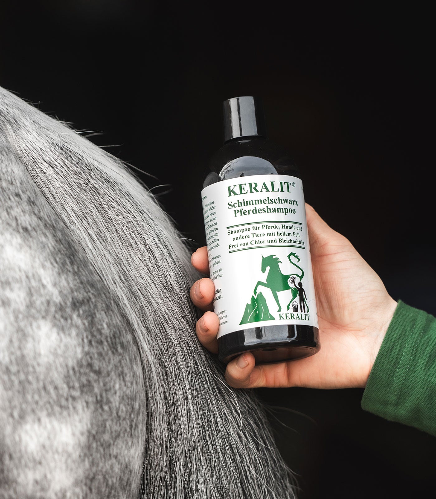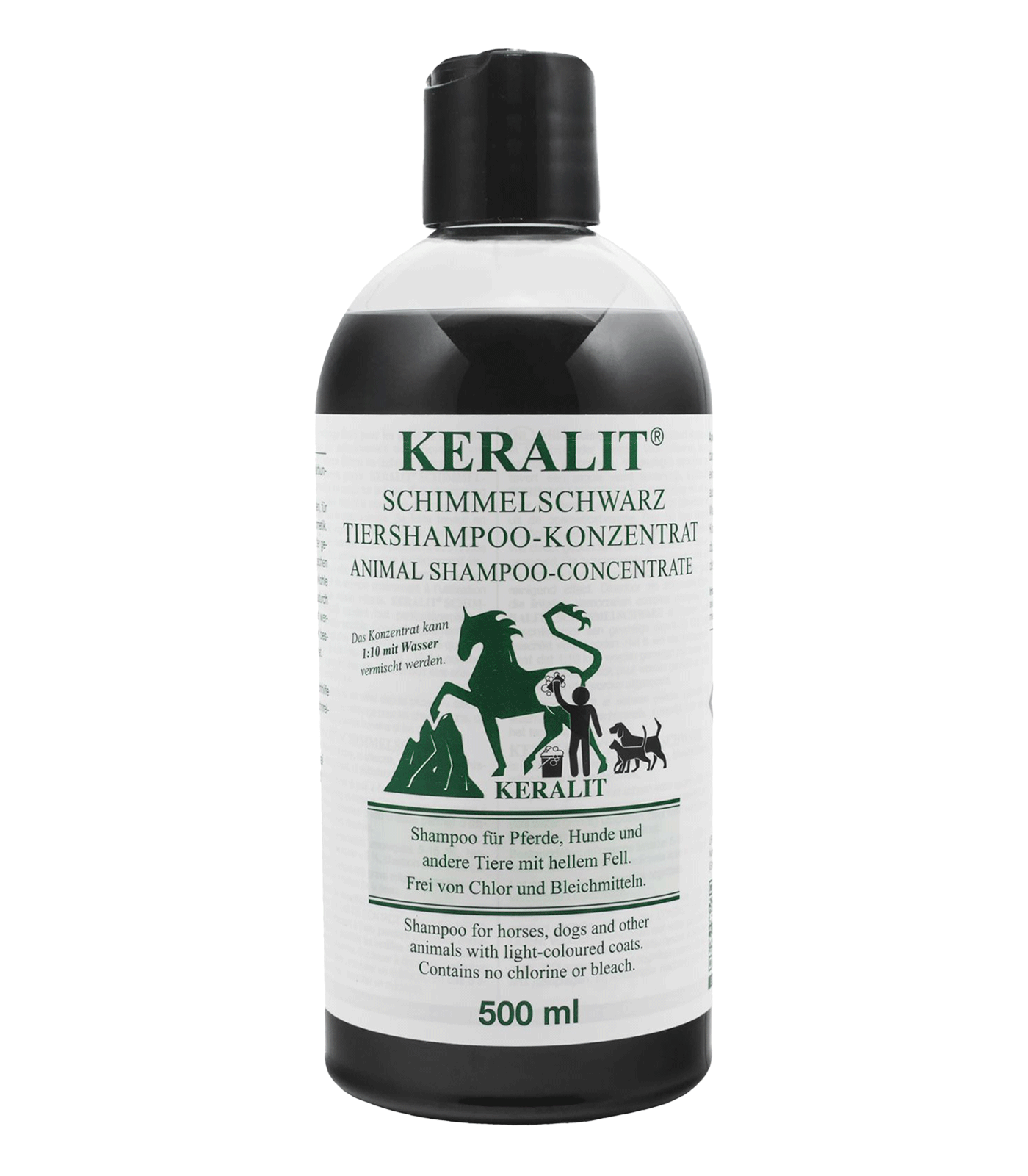 Sanfte Reinigung für Fell, Schweif und Mähne. Insbesondere bei Schimmeln, Schecken, Palominos. Verfärbungen verschwinden, sauberes Fell kommt wieder hervor. KERALIT Schimmelschwarz basiert auf einem milden, von Veterinär-Dermatologen auf die Tierhaut optimierten Babyshampoo aus der Humankosmetik. Durch den hohen Anteil an medizinischer Aktivkohle wird der gelöste Schmutz sofort gebunden und kann leicht ausgewaschen werden.