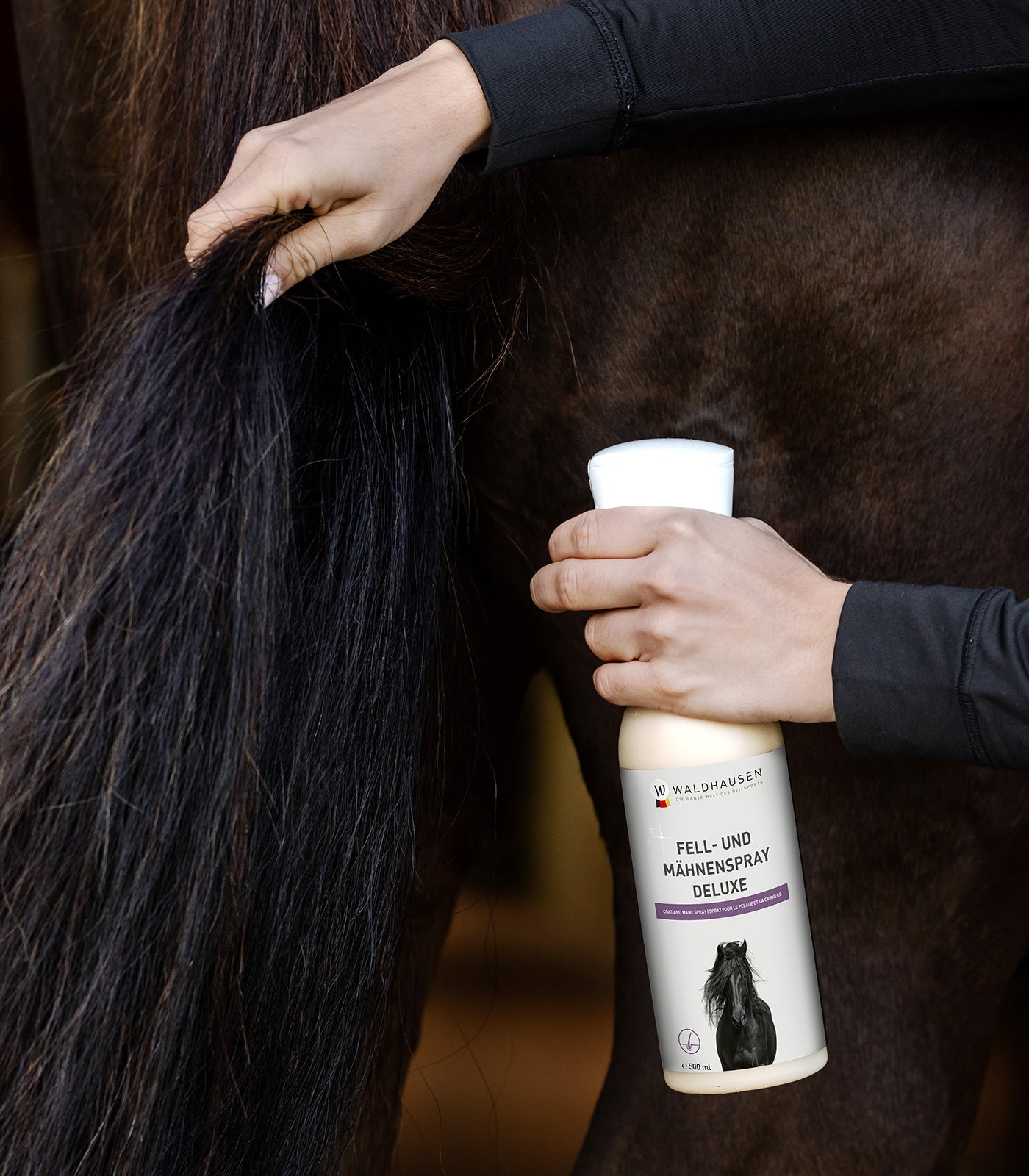 Pflegendes Spray für Fell, Mähne und Schweif mit schmutzabweisender Wirkung. Das Haar wird knotenfrei, leicht kämmbar und erhält Volumen, es fällt locker und glänzend. Der besondere Sprühkopf verteilt das Produkt gleichmäßig im Haar.