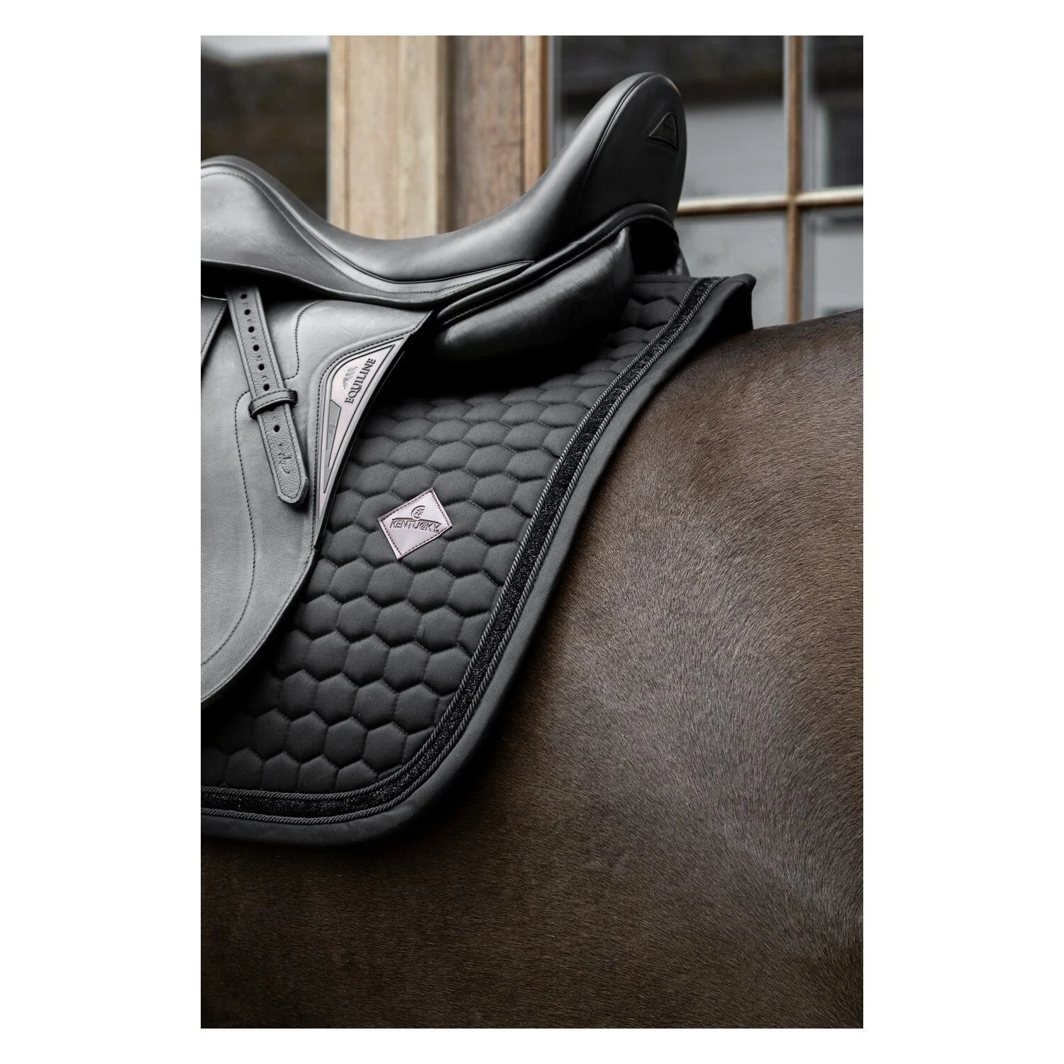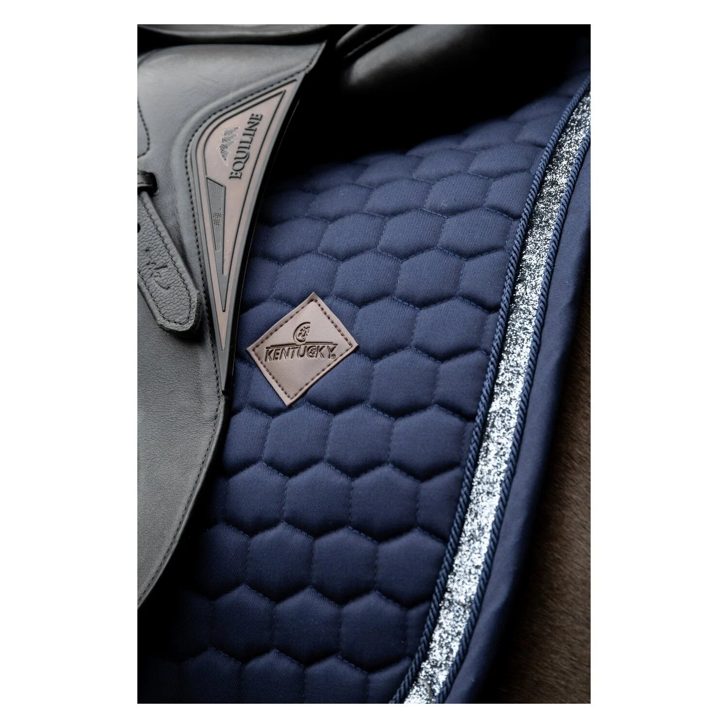 Die KENTUCKY Samt-Schabracke mit dem Polar Fleece Velvet Bandagen-Set ist ein hochwertiges Reitset für Dressurreiter, die Wert auf Eleganz, Komfort und Funktionalität legen. Die edle Samt-Schabracke von KENTUCKY überzeugt durch ihre stilvolle Sternsteppung, eine doppelt gedrehte Bordüre und eine optimale Polsterung, die den Pferderücken zuverlässig schützt und den Druck gleichmäßig verteilt. Durch den praktischen Nylonriemen zur Befestigung am Gurt kommt die Schabracke ohne störende Sattelschlaufen aus und liegt besonders ruhig unter dem Sattel – ideal für Dressurtraining und Freizeit.